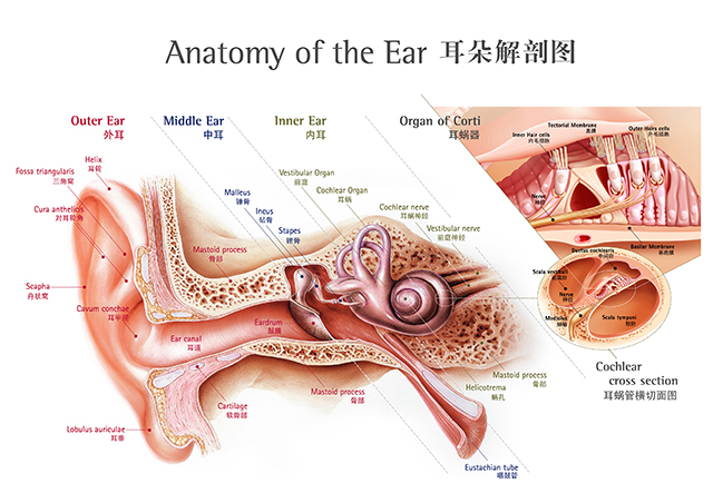 聽覺功能的產(chǎn)生過程很復(fù)雜,以下給予簡單介紹。首先,耳廓將外界的聲音收集傳至外耳道內(nèi),略有彎曲的外耳道將聲波不斷的傳至深部的鼓膜處,不同強(qiáng)度和不同頻率的聲波使鼓膜產(chǎn)生不同振幅的振動,連接鼓膜另一面的三個聽小骨(錘骨、砧骨和鐙骨)互為鏈狀連接,繼續(xù)將聲波傳導(dǎo)至與鐙骨相連的卵圓窗處,使窗內(nèi)的淋巴液引起波動,刺激淋巴液內(nèi)的重要結(jié)構(gòu)膜耳蝸的——基底膜,而基底膜的表面有很多感覺細(xì)胞(毛細(xì)胞),它與聽神經(jīng)的很多細(xì)小末梢相連,聲音產(chǎn)生的刺激信號經(jīng)聽神經(jīng)傳導(dǎo)到達(dá)顳部的聽中樞加以分析處理。人體根據(jù)聽到的聲音做出相應(yīng)的反應(yīng)。