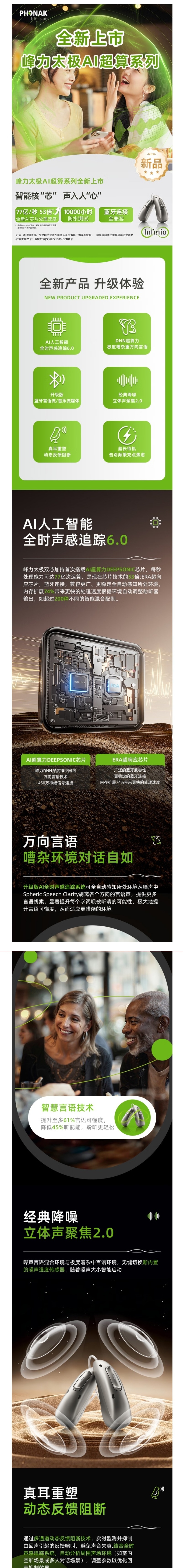 全新的峰力太極助聽器。它提供了無與倫比的降噪技術,幫助輕度至極重度聽力患者重獲新聲。它不僅有峰力超響應ERA芯片,還有全球峰力首款AI超算力DEEPSONIC芯片用于助聽器內部的聲音處理,帶給您360°環繞方向的言語清晰度,萬向悅言語,尊享超聽覺。